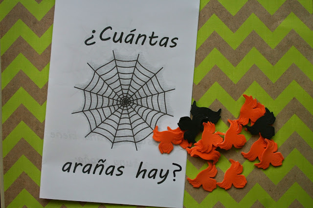 For the letter A at our house (pronounced “ah” in Spanish) we did some fun araña (spider) activities. First we made a little spider story to practice counting and asking “How many?” I have shared the story below so you can print one out too and follow along at your house! Since the holiday Halloween is upon us where we live, I thought spiders would be a nice and spooky place to start with our alphabet learning in the month of October.