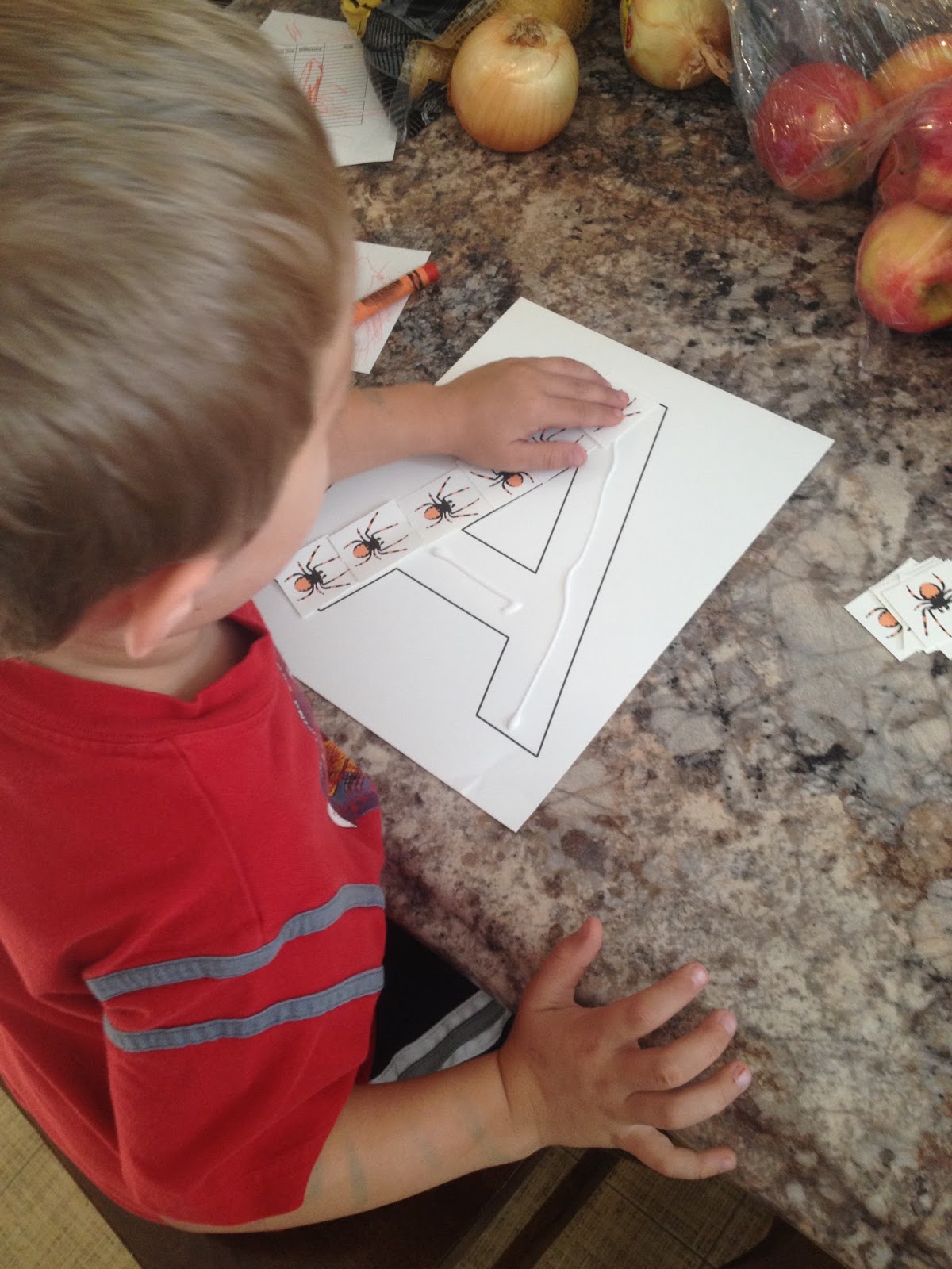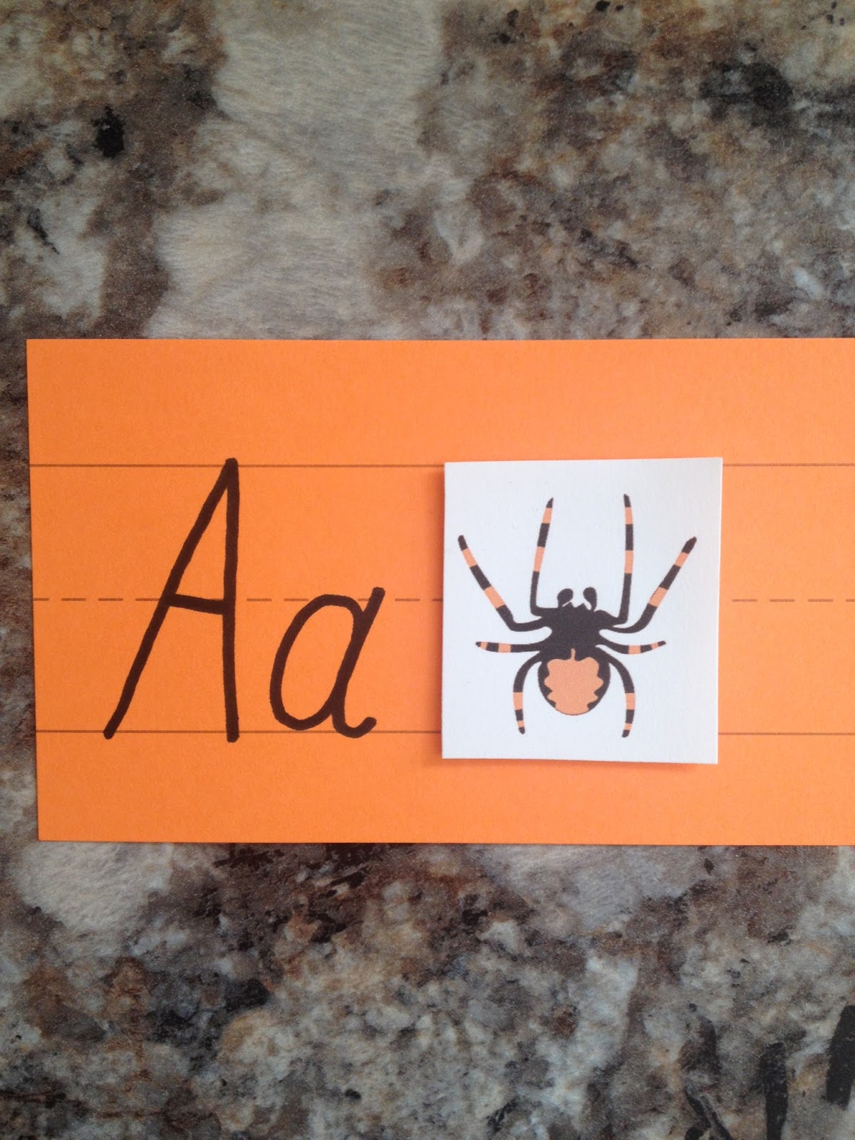In addition, I wrote the letter A on a sentence strip and glued one of the extra spider pictures next to it. This will hang above our kitchen table so we can practice it and see it each day as we eat. Then I can add to it for each letter that gets introduced.
