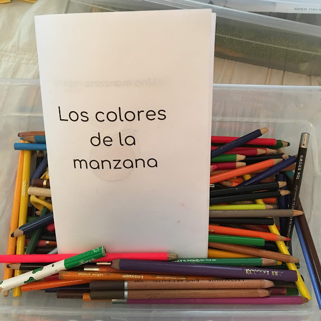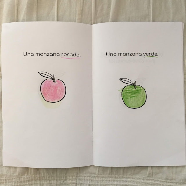 Finally I made this little mini book about apples and colors: “Los colores de la manzana.” I like to make books that have repetitive sentences where one thing changes throughout. It also helps if it is silly! My kids don’t notice it’s a lesson if we are being silly!!
