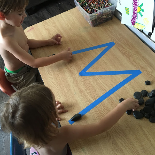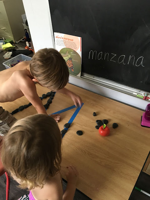 One quick and super easy activity you can do when learning about anything in Spanish is to tape the beginning letter of the word (or even tape the entire word) on a table or floor, and have your kids use found objects to build the letter. They can also simply trace the giant letter with their fingers. This works great for kids who are little and ready to learn letters and handwriting, but who still need more practice with fine motor skills. Making letters big keeps it fun and approachable for them.