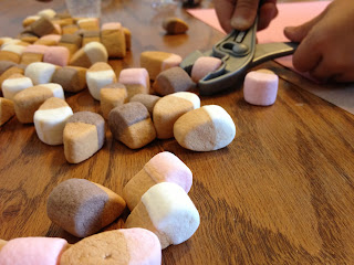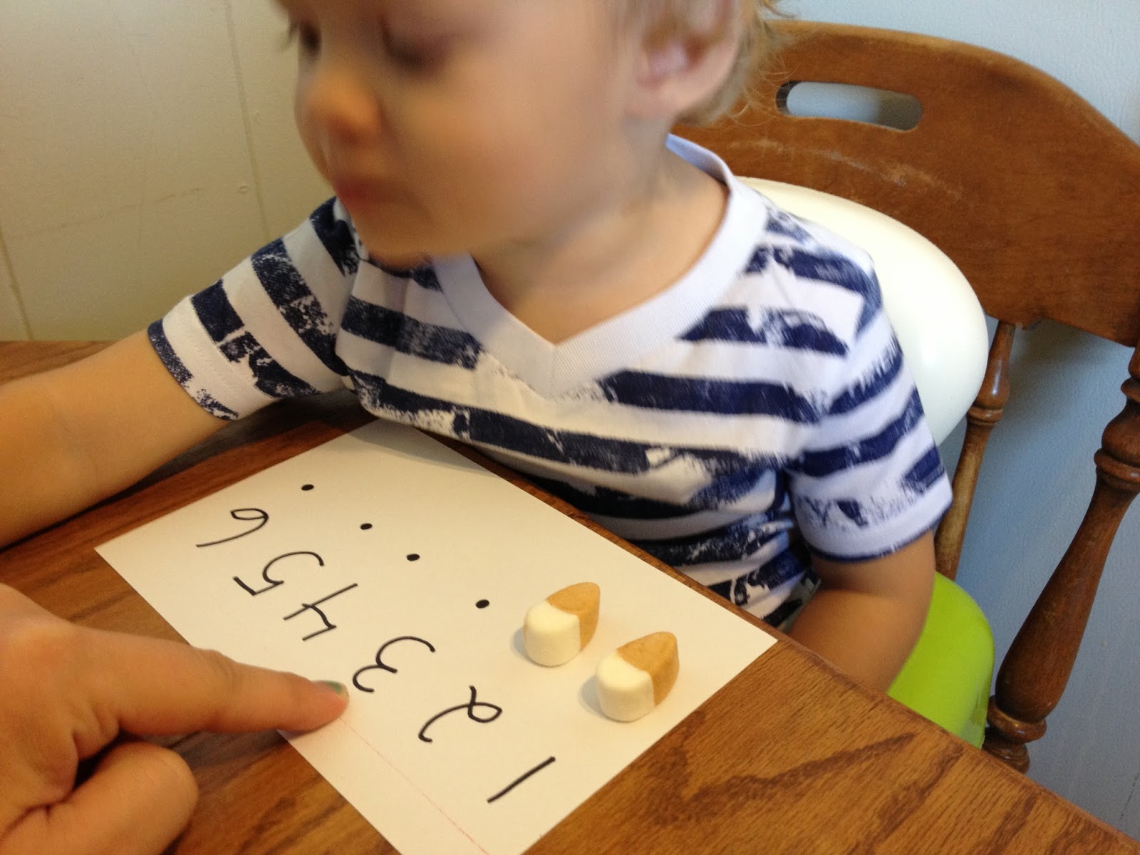 I would say things like, “There are six marshmallows!” Then he would snatch one away and eat it. I would dramatically say, “Oh no! Now there are only five!” And so on. He of course liked this little game.