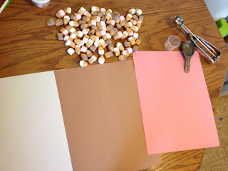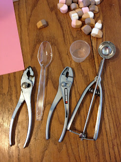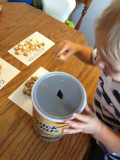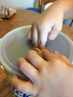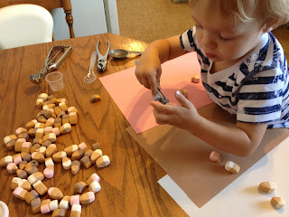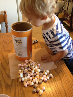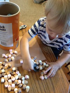 We had an empty oatmeal container sitting around so I cut a small hole in it to have him poke some marshmallows through. I thought this would be a good fine motor muscle builder! It was actually more difficult for him than I anticipated…he tried a few and then we moved on.