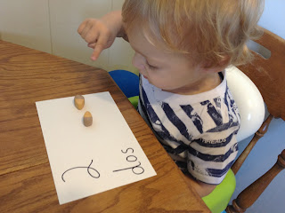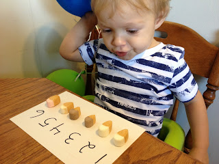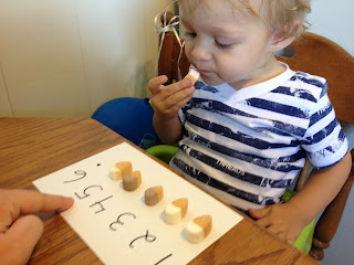 Next I used one of the index cards to make a simple number line. Each number has a dot below it. We counted out each one, and then we practiced taking away. He liked this part because I let him eat one to take it away.