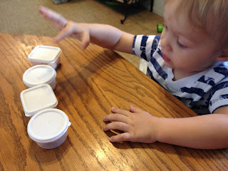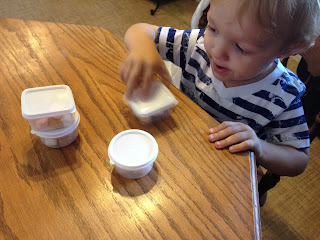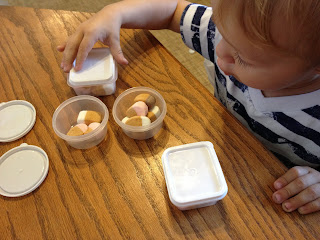 I also got out some little containers and filled them with marshmallows. They were too tricky for him to open (he tried a few times) but he could put the lid on. This was a good shape matching/differentiation activity since some were circles and some were rectangles. We talked about the shapes….