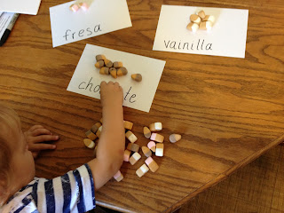 After our counting games, I tried a little sorting. I wrote out the three flavors of ice cream cones on some index cards. I modeled the sorting using language (in Spanish first, then English) like, “The strawberry ice cream goes here. The vanilla goes here…” Then I gave Little Guy a turn. At first he did not quite know how to follow my lead, and if he would put one in the wrong place I would be silly and say “Uh-oh! That’s chocolate….look it goes right here!” After a while he caught on, and then he thought it was funny to put one in the wrong place to see me say “Uh-oh.”