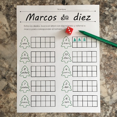 Much of what I do for Spanish lesson ideas consists of scouring the internet for meaningful learning activities in English, which I then translate into Spanish. When I began researching math curricula for my Kindergartner, I came across the word subitize, which to my knowledge means “to recognize a number without counting.” I had never heard of it, and had no awareness of it being a necessary math skill. Spanish is my forte, remember? Since then, I continued my research on how to teach numbers to kids and built my collection of math resources and ideas. For example, I bought this extensive Numbers 1-20 Mega Bundle from “A Spoonful of Learning.” And that is where I came across ten frames. For a while I used the ten frames without thinking about it, trusting that the math-teaching experts had me covered. Then one day while reading more materials about teaching math to kids (I have to do a lot of research on teaching math!) I discovered the ten frame tool is used to help kids learn how to subitize! Finally I understood why I kept seeing them EVERYWHERE. And like all good things I find on the internet, I make sure we have a SPANISH version to go with it. One of my favorite ten frame resources is this fun Pumpkin Ten Frame game from Playdough to Plato. It inspired the Christmas tree ten frames I made here. (You can download the printable with the link at the end of this post.) Make sure you visit Playdough to Plato for the instructions on how to play.