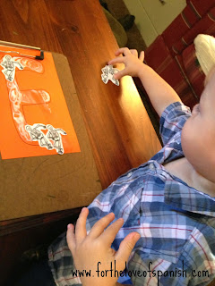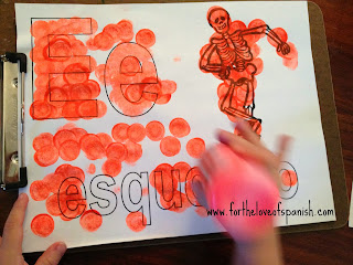 Later in the day, after reading and acting out the books, we sat down to do some “clipboard work,” as we call it. We made la letra E out of esqueletos and did an esqueleto coloring page with dot markers. You can print your own from the printable below. We will be linking this post up with the “31 Days of ABCs” on the page for the letter E!