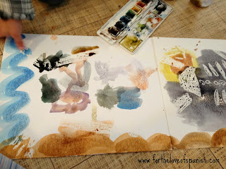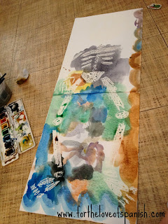 On another day, while my Little Guy was napping, I got out some watercolor paper and taped two pieces together. I drew on a “secret” picture of an esqueleto with a white crayon. Next I had Jefe (my older son) come over to see it. I told him we were going to paint the paper with watercolors to reveal a secret message. He kept trying to turn the paper over as we painted to find the message–it was cute. Even though I knew what the secret message was, I think I had more fun than he did painting the paper and watching the esqueleto reveal itself.