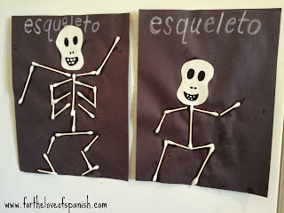 We have had a lot of fun around here lately doing alphabet activities and crafts alongside all the great bloggers participating in “31 Days of ABCs.” Many of the activities we have chosen to do relate to fall or el DÃa de los muertos. For the letter E (la letra E, pronounce “ay/eh”) we talked about esqueletos. The song “Los esqueletos” from Babelzone on YouTube inspired us. Even if you cannot understand all of the Spanish words, it has such a catchy tune you will find yourself singing along!