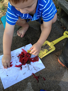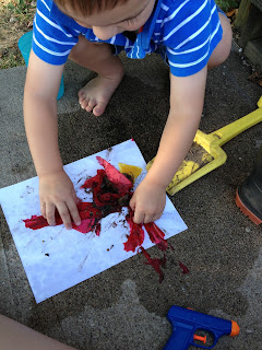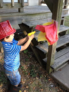like in this art project here so we could have a neat piece of “fire” art at the end as well. However, apparently not all tissue paper bleeds. Oh well, the boys found other “projects” to do with it, which of course involved dirt and rocks.