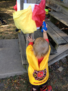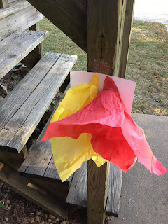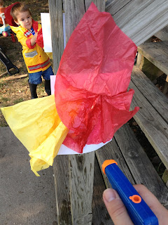 Of course, we could not read this story without doing a fire-themed activity as well. So I taped some red and yellow tissue paper to some white card stock, and hung them on our deck posts outside. We gathered up all of our