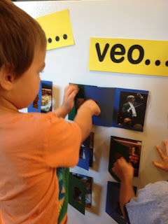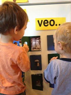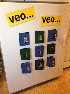 It took me a while to decide how to present the activity. I decided to print off some text that says, “Veo…Veo…” which means “I see…I see…” and hang it on the refrigerator with all the “doors.” If you do this activity at home you can use phrases like these: