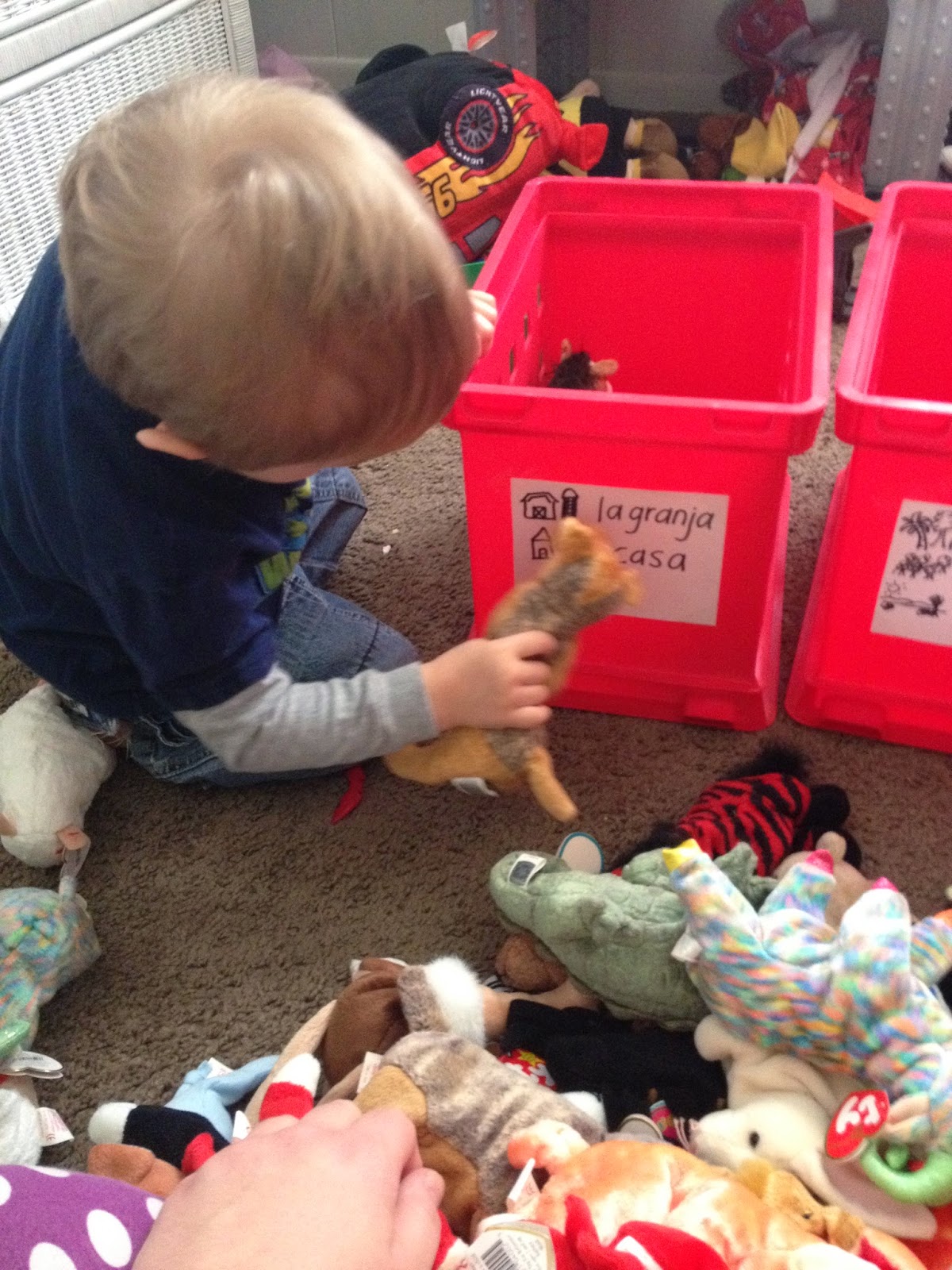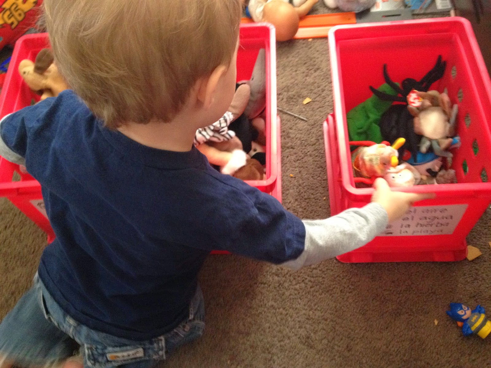 Your labels may look different than ours, depending on the toys you decide to sort. If you need help finding the Spanish word for your sorting categories, just go to www.wordreference.com and use the English-Spanish dictionary to help you out. Our sorting categories were: