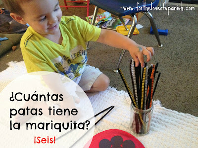 Count out the spots as you hand them to your child, and count them as you glue them on. If your ladybug has more than ten spots, go here to watch a video on numbers past ten in Spanish.