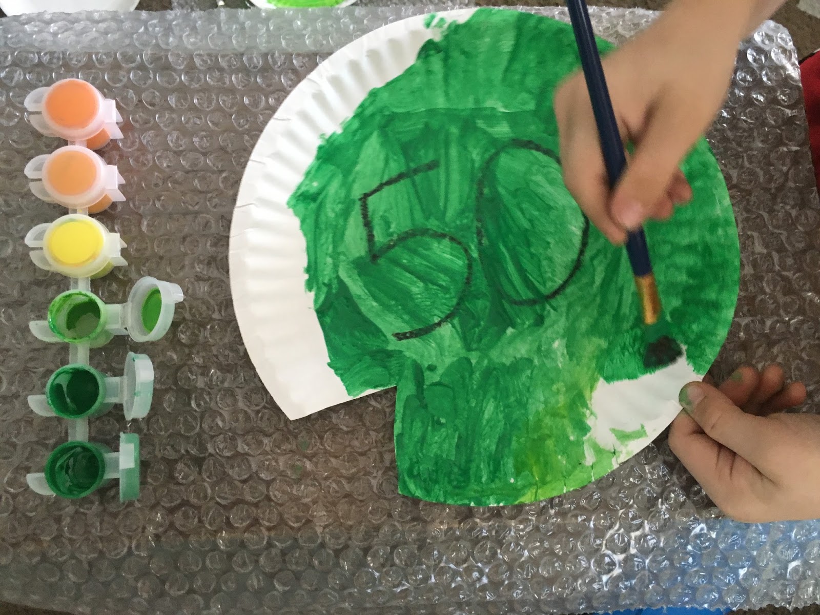 You of course don’t have to make lily pads in order to do this activity, but it does add some extra opportunities for language (like talking about the word for lily pad, frog, the color green). For our play date I prepared the paper plates beforehand by cutting out the triangle shape and writing the numbers 10, 20, 30, 40, 50, 60, 70, 80, 90, 100. I set the plates out on the table with green crayons and markers for the kids to color as they arrived.