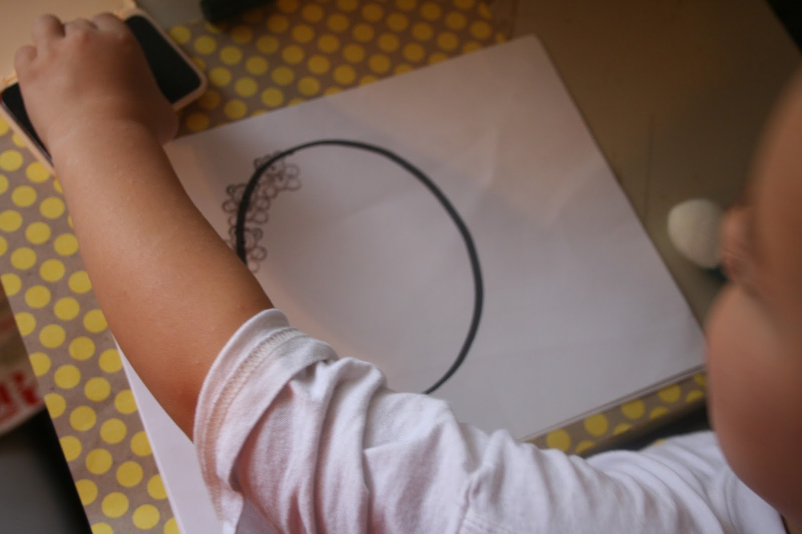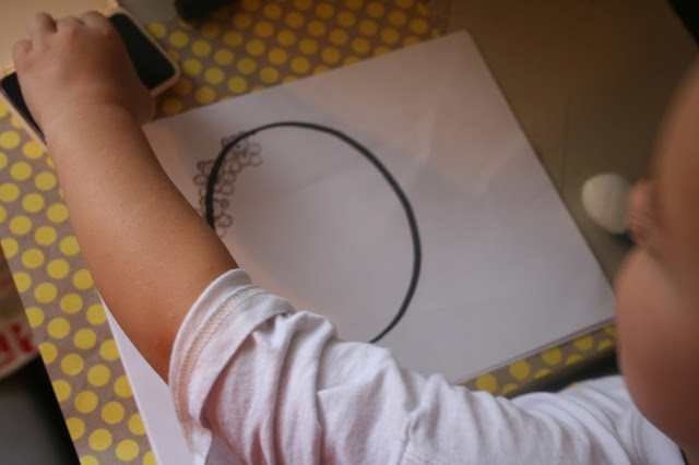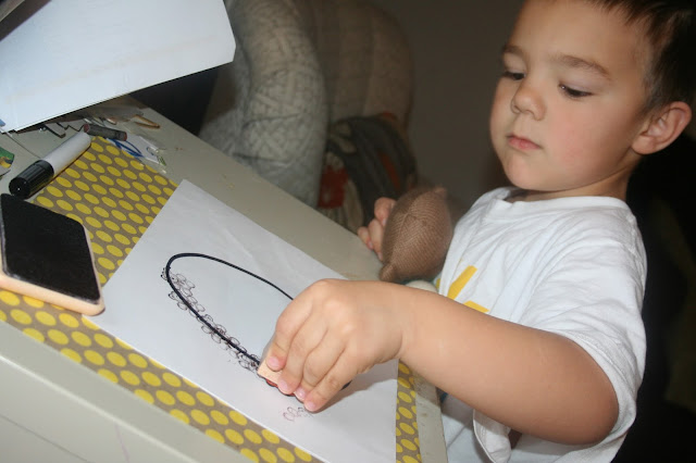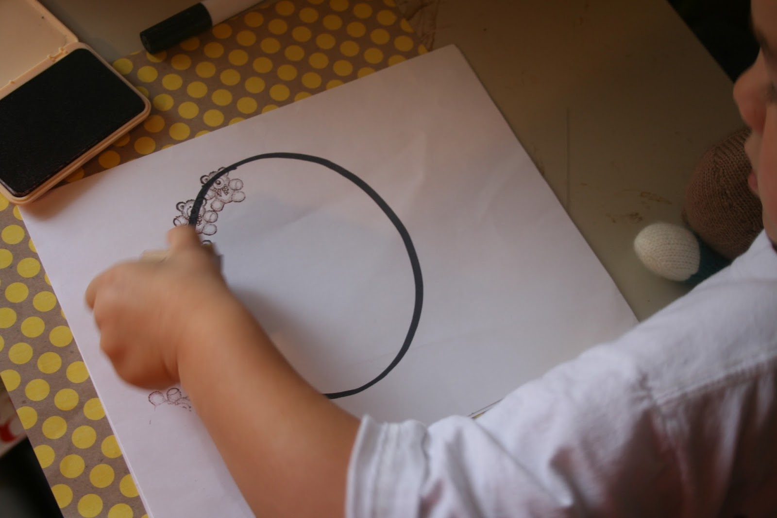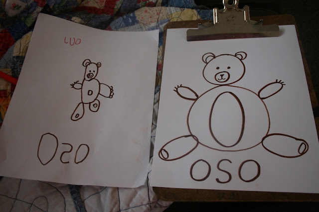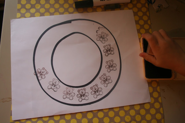 I dug out an old bear stamp from the rubber stamp collection I had from my high school days. I drew an “O” on a paper and had my oldest stamp bears around it. He was working on learning how to form his letters at that time.