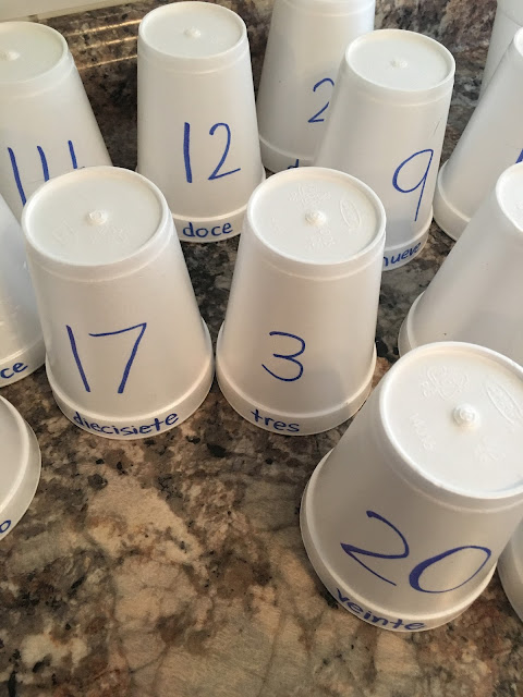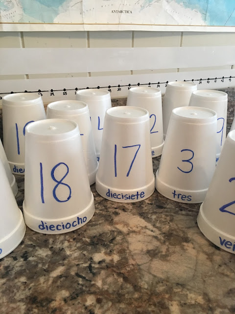 All I did here was make a little set of cups with the numbers written in Spanish. If you need help knowing how to spell the numbers 1-20 see the chart below. These cups took me about ten minutes to make.